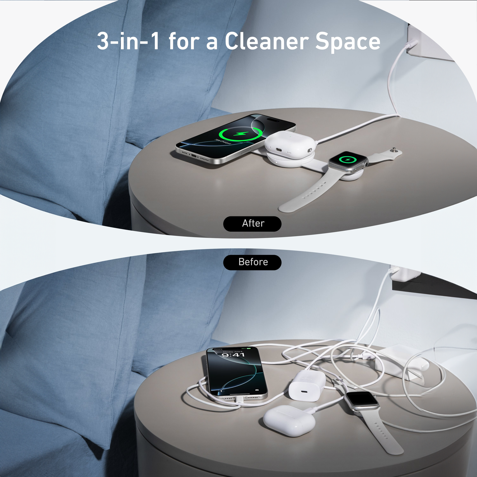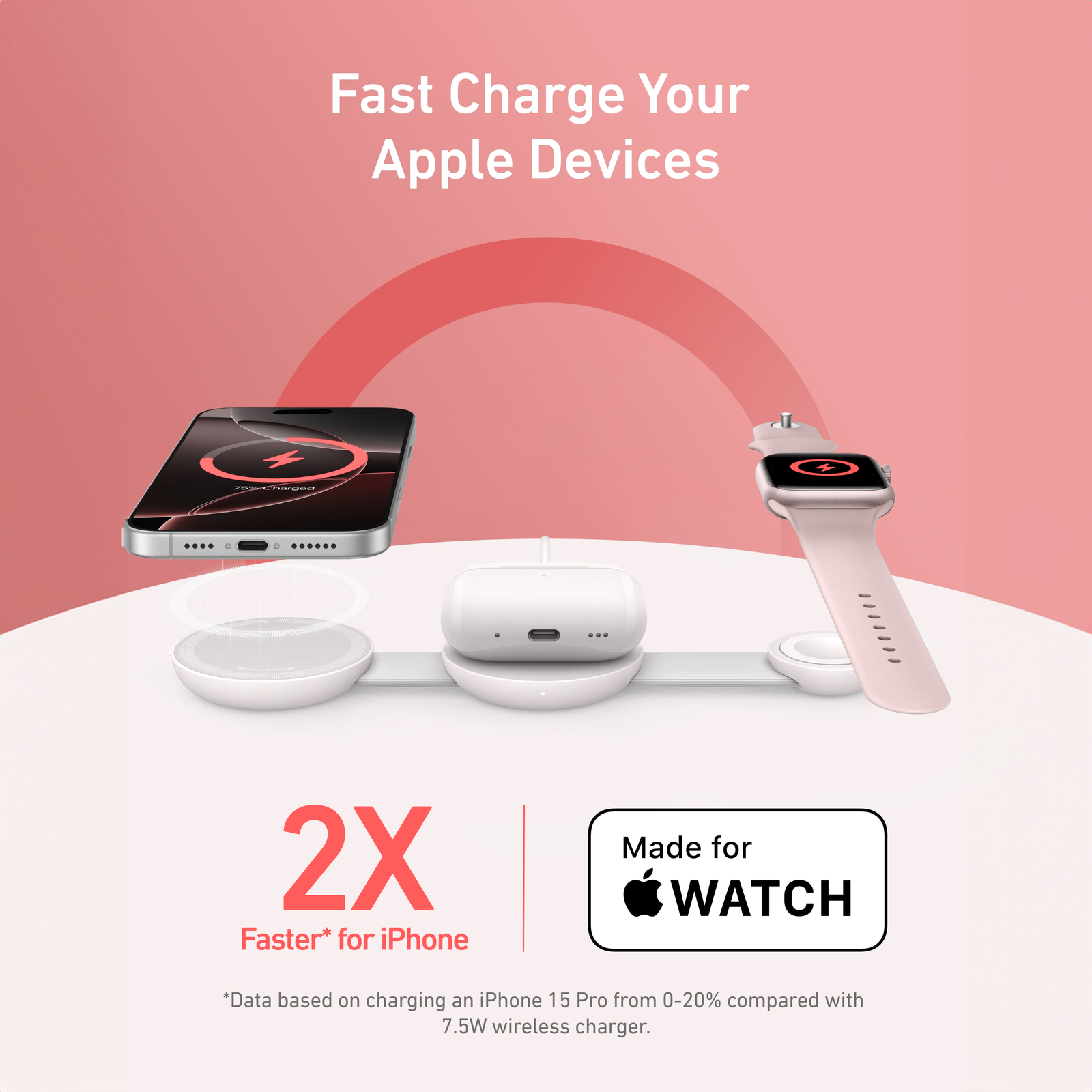 15W Fast Charging for iPhone and Apple Watch: Quickly power up your iPhone 15 Pro to 20% in 15 minutes and an Apple Watch Series 9 to 30% in 22 minutes with a certified and MagSafe-compatible wireless charger. (Note: This product is not a power bank.) Travel-Friendly and Ultra-Portable: Take the convenience of wireless charging anywhere with a foldable, baseball-sized Qi2 3-in-1 charger. 3-in-1 Wireless Charger: Keep your workspace uncluttered with a 3-in-1 wireless charger that powers multiple devices simultaneously. StandBy Mode for Optimal Viewing: Improve your iPhone's usability with a charger that offers landscape viewing and supports StandBy mode when folded. What You Get: Fusion X MagGo Wireless Charging Station (3-in-1, Foldable Pad), 5 ft (1.5 m) USB-C to USB-C cable, welcome guide, 24-month warranty, and our friendly customer service.